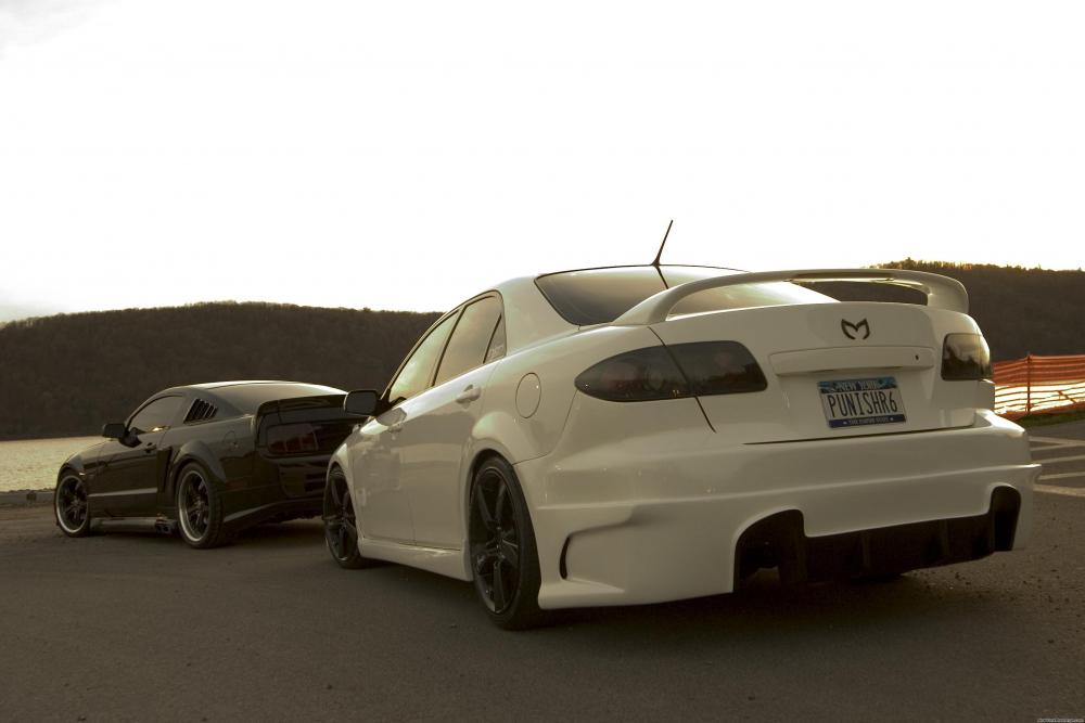 Mazda and Mustang behind